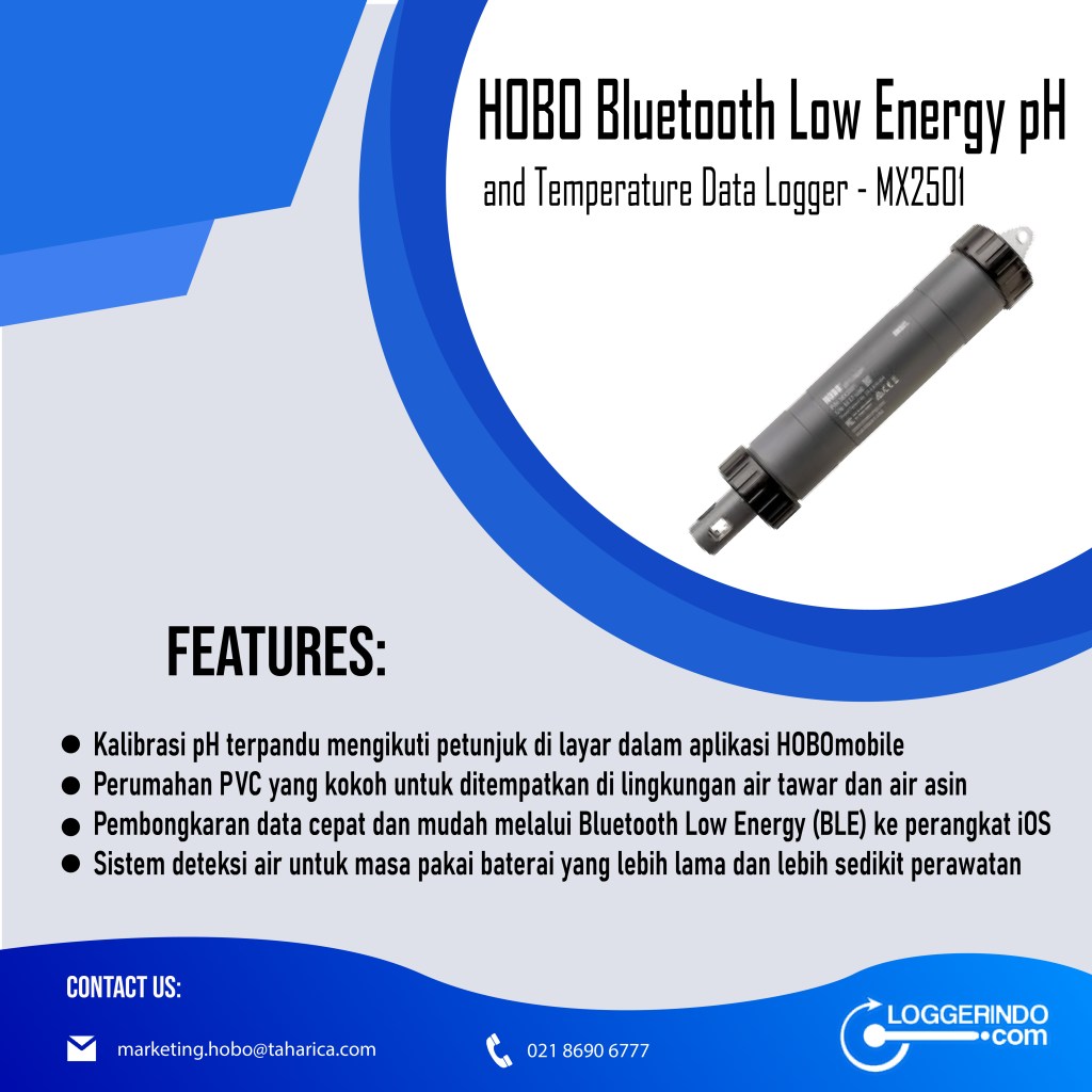 Maka dari itu, dengan menggunakan HOBO Bluetooth Low Energy pH and Temperature Data Logger – MX2501 kita dapat memanfaatkan nya untuk pemantauan pH jangka panjang di muara, danau, sungai, sungai, dan lautan. Memanfaatkan teknologi Bluetooth Low Energy® (BLE), MX2501 pH Logger berkomunikasi secara nirkabel dengan aplikasi HOBOmobile® gratis di perangkat iOS yang membuat pengaturan logger, kalibrasi, dan pemuatan data dengan cepat dan mudah. Proses kalibrasi pH terpandu pada aplikasi HOBOmobile membuat proses rumit yang lebih mudah untuk diikuti. Logger yang terjangkau dan kompak ini secara dramatis memotong waktu dan upaya yang diperlukan untuk mengumpulkan data lapangan, sementara juga menawarkan data resolusi yang lebih tinggi.